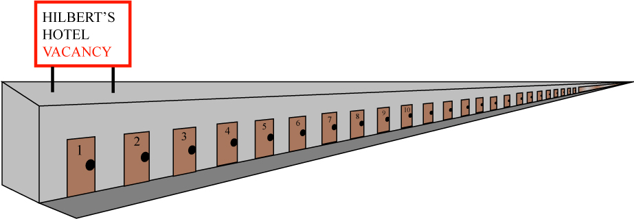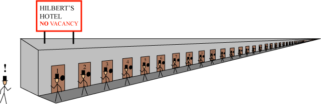 Now let us suppose that there’s a convention on the mathematics of infinity in town and Hilbert’s Hotel has been completely booked — there is no vacancy in the hotel.  However, another mathematician arrives late to town and needs a room: what is one to do?