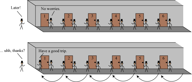Hopefully it is becoming clear how this connects to Hilbert’s Hotel, but to see it explicitly, let’s introduce a variant we can call “Hilbert’s roommate problem.”  Let us assume that every room in the hotel is booked and has two people sharing.  However, a single person in one of the rooms decides to leave.  Can we still have all the rooms filled, and allow that person to leave?  Sure!  We just ask one of the roommates in each room to move one room to their left.
