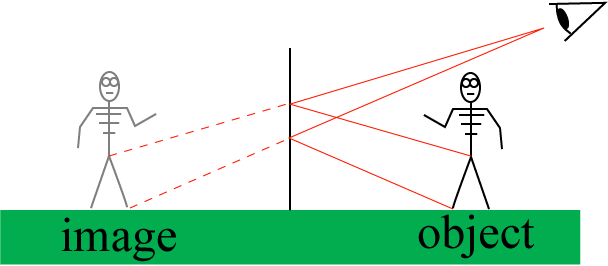 Illustration of a “ghostly” reflection in a pane of glass. Several rays of light reflected off of the glass, and their trajectory as apparent to the observer, have been drawn.