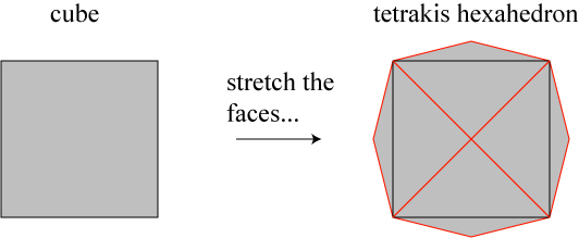 We have now created a tetrakis hexahedron, as there are 4 sides per pyramid and six faces to the cube! 4 times 6 = 24, obviously! It should be noted that the vertices are no longer all the same: the peak of each pyramid is not equivalent to one of the corners of the former cube.