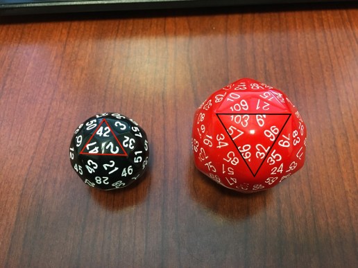 It should be noted that the d60 and d120 end up pushing the limits of what might be considered a useful shape for a die. They are both quite spherical (the d120 is larger than a golf ball), and will roll for a long, long time before coming to rest on a number. Furthermore, the numbers are so closely packed together that it can be somewhat tricky, at a glance, to figure out what the actual rolled result is! It may be possible to make dice which have an even larger range of numbers, but they wouldn’t be terribly practical.