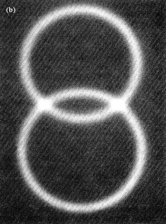 In Type-II SPDC, the two output photons always have perpendicular polarizations. The conservation of momentum results (in a way too difficult to explain here) in the output photons propagating along two intersecting conical surfaces. If one projects this output onto a screen, one will see two intersecting circles, as pictured below.4