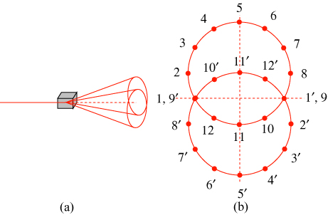 Illustration of (a) the cones of photons in Type-II SPDC, and (b) the relative positions of photon pairs. From my Singular Optics book!