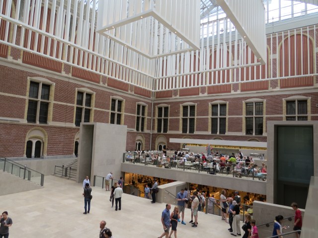 As I noted, the Rijksmuseum was largely closed for renovations for a long time, running from 2003 to 2013.  One of the big additions to the new museum is this magnificent basement-level entry hall, cafe and gift shop.