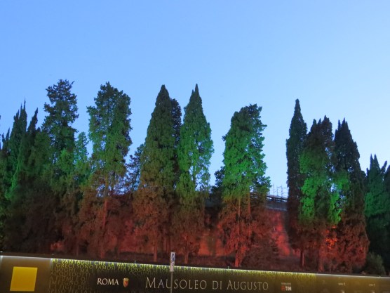 We next followed a general path from the Spanish Steps towards the river, and as the sun was setting we walked past the massive and ancient Mausoleum of Emperor Augustus, built in 28 B.C.E. It was apparently under renovation while we were there, but the lighting on it at night was quite lovely. There were plenty of restaurants around the place, and I found it fascinating that you could eat a nice meal in sight of such an ancient and somber landmark.