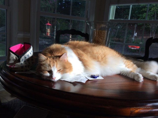 Fluff was also incredibly vocal. He had a loud proud meow, almost like he was talking to us, and was happy to ask for pettings, and follow Beth around until he got them. When we had cleaning people coming to our home, he would follow them around and meow at them, too, which left them confused, amused and exasperated.