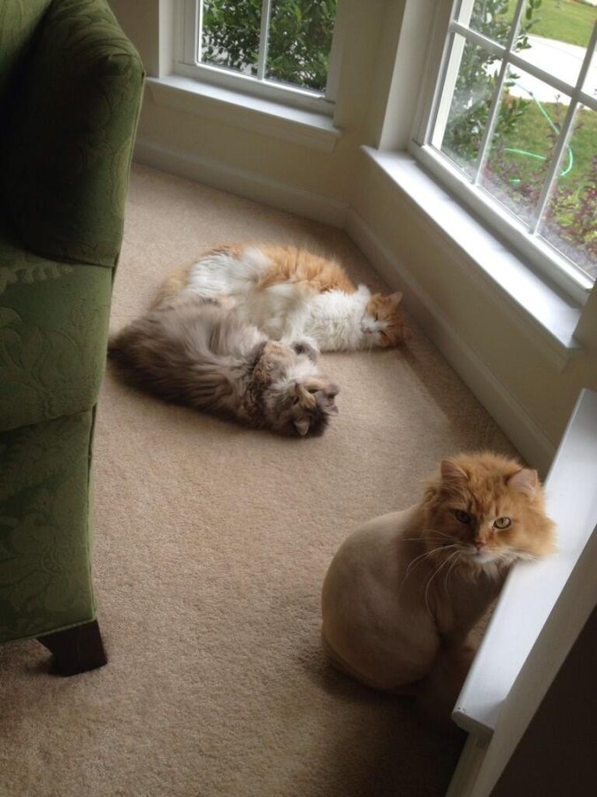 Fluff, Sasha, and Mandarin with a lion cut, from June 2013.