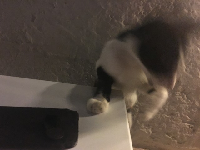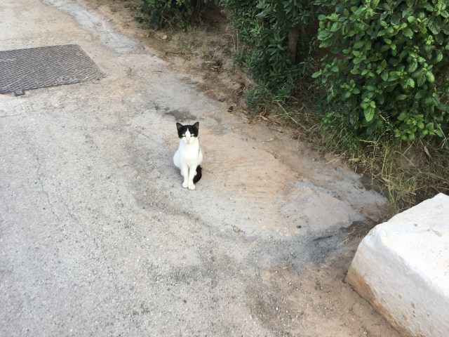 The kitty was so adorable that I ended up giving about 1/4 of my food — halloumi and chicken kabobs — to him/her. After the feeding began, the kitty got a bit more bold and I had to give him/her a bit of gentle chiding.