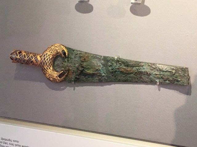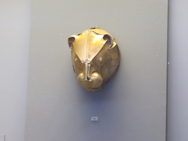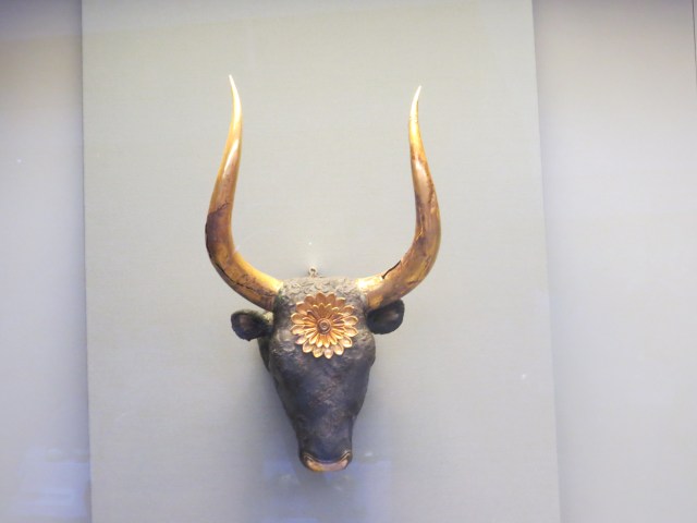 The first thing one encounters on entering the museum are the spectacular treasures of Grave Circle A, Mycenae, a 16th centure BCE royal cemetery near the citadel of Mycenae. It was excavated by the German archaeologist Heinrich Schliemann in 1876, uncovering a magnificent and beautiful golden hoard. You may not think you’ve heard of it before, but look at the image below and you’ll change your mind.