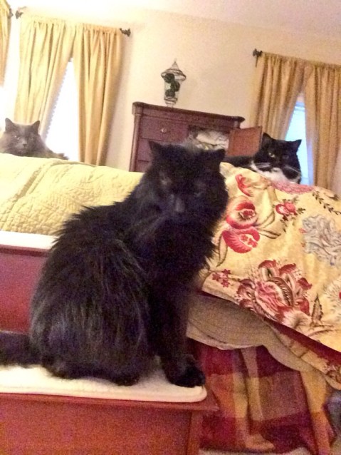 He was charming in his cluelessness. When Beth adopted him, he had just been found wandering in the woods, meowing in confusion — like I said, he wasn’t a wilderness cat. The first time we purchased a tall kitty condo, Simon climbed all the way to the top, but lost his balance and almost fell out. We started laughing, and Simon was so mortified that he jumped down and refused to interact with us for a while!