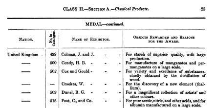 What Crookes had inadvertently discovered was a previously unknown metallic element, which would be given the name thallium. Today, thallium is used in optics, electronics, and medicine; in Crookes’ time, its most practical application was vaulting him into scientific celebrity status almost overnight. In short order, Crookes displayed his new element at the 1862 world’s fair known as the Great London Exhibition. His work appeared alongside other impressive discoveries such as the electric telegraph, the first man-made plastic, one of the earliest refrigerators, and parts of Charles Babbage’s analytic difference engine; even in this formidable company, Crookes won an award for his discovery. By 1863 he was elected a Fellow of the Royal Society, a remarkable twist for a person who essentially did science as an amateur occupation.