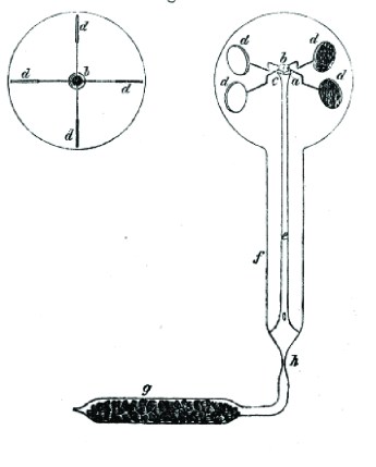 At last, on February 10, 1876, in the third part of his series of presented papers [7], Crookes officially introduced the first form of his radiometer, and gave it its name. His original figure is illustrated below; he also referred to it, for obvious reasons, as a “light-mill.” The device had already been previewed to the scientific community at another Royal Society soirée in mid-1875, where it received international attention and acclaim.