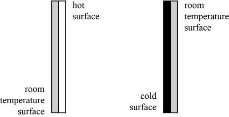 Ironically, though Osborne Reynolds was the one who suggested that the imbalance of pressures was causing the radiometer to move, he would eventually argue against his own hypothesis. In a lengthy paper published in 1879, Reynolds imagined [12] a pair of plates of infinite size, parallel to one another, as illustrated below. If Reynolds’ original argument holds, one would expect that the hot plate would feel more pressure than the cold plate, and that the pair of them would experience a spontaneous net motion to the left. But, because the plates are infinite, the gas between them would be trapped and also move to the left; there would be nothing moving to the right, and the system would violate the conservation of momentum.