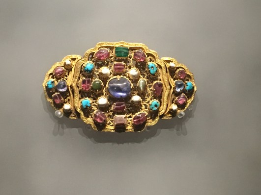 Gem-inlaid gold buckle, from the tomb of Zhu Tan. The center is sapphire, surrounded by rubies, sapphires, cat’s eyes and turquoise.