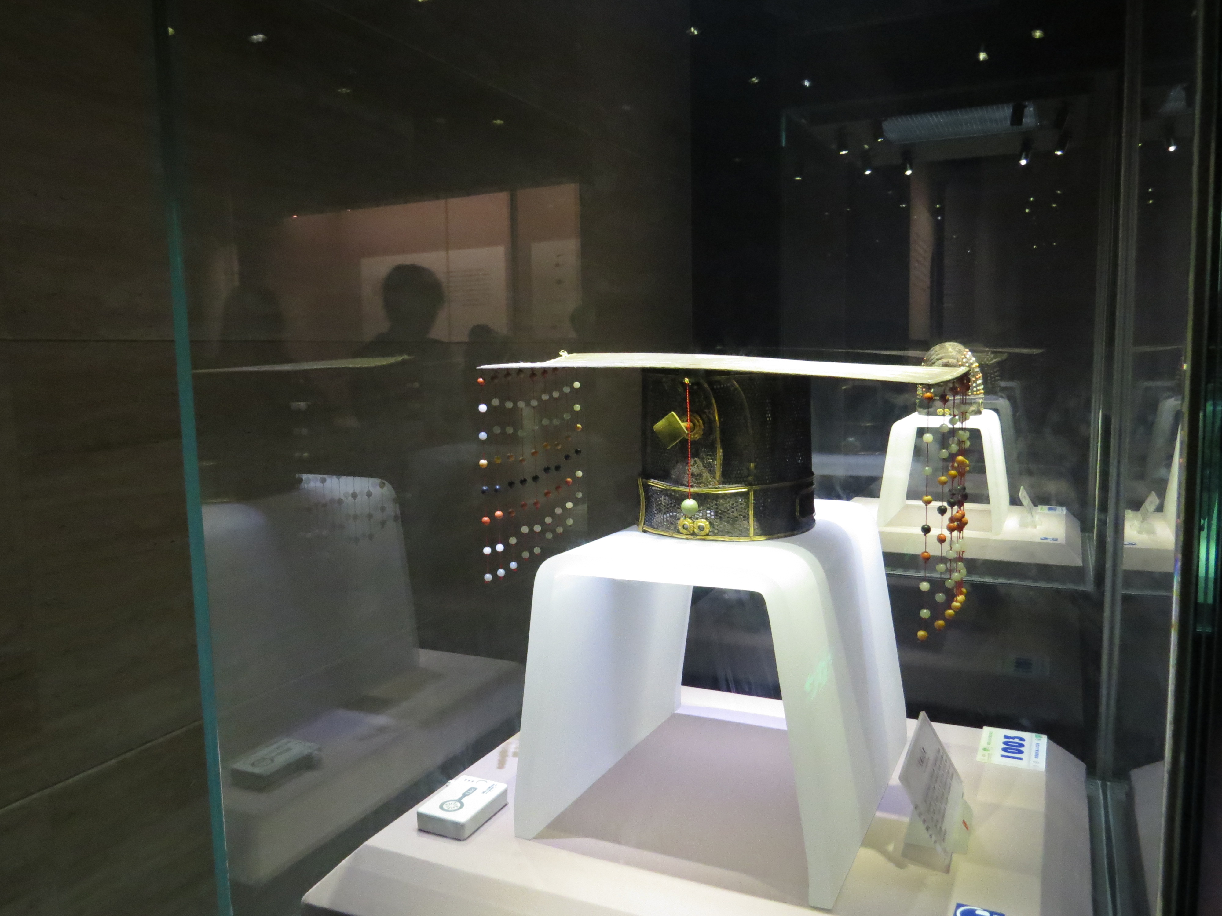 Nine-tasselled crown from the tomb of Zhu Tan. The cylinder is bamboo, the top is wood, and gold is used in the borders.