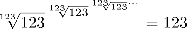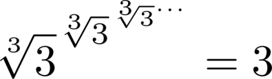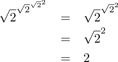 Hopefully you can see the trend. If we keep putting the new value of x into our original equation, and do it an infinite number of times, we will get an infinite chain of powers which must evidently approach 2.