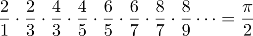 A formula like this gives one a way to approximate the value of π as accurately as one likes. The more one continues the chain of multiplications, the closer one gets to the true value of π/2. So if you are ever on a plane that crashes in the wilderness, and you need to calculate the value of π by hand, now you know what to do!