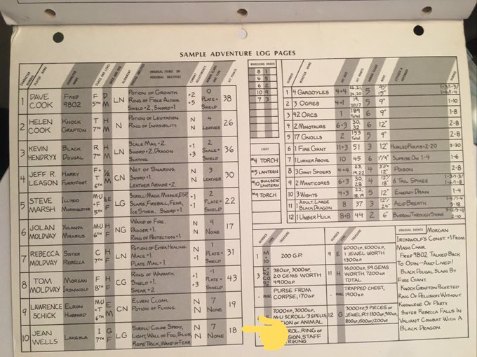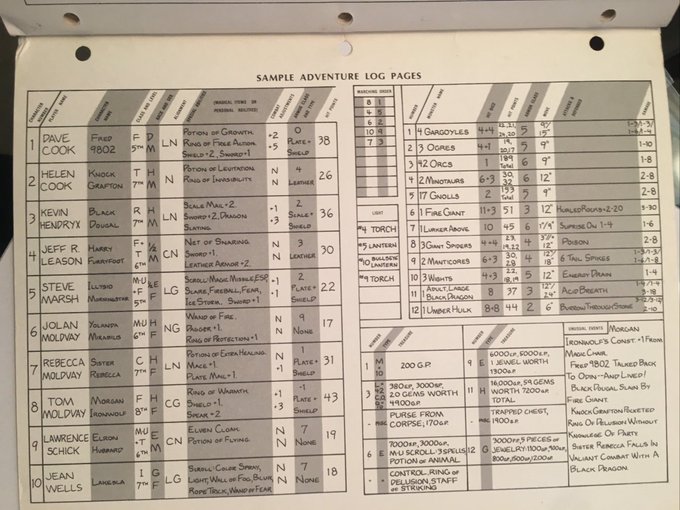 A DM could use Adventure Log pages to keep track of characters and monsters, as the sample page shows! (Note: the player names are actually people, and some at least are original D&D designers and gamers!)