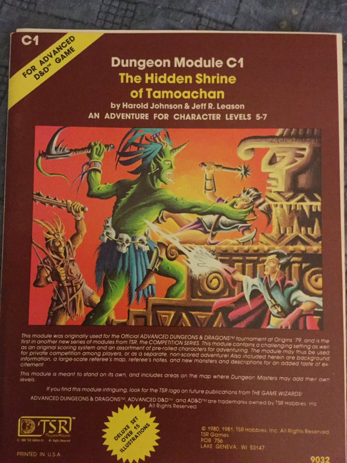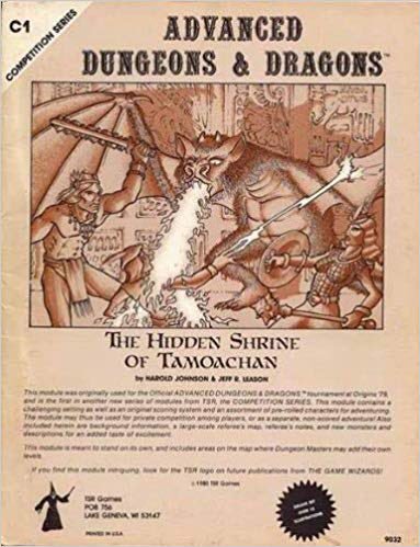 C1: The Hidden Shrine of Tamoachan (1981), by Harold Johnson and Jeff R. Leason. This module marked a couple of milestones for D&D publishing. It was the first adventure in the “C” (competition) series of modules, originally designed for the AD&D tournament at the 1979 Origins Expo! Because of this, it includes rules and pregenerated characters for use in tournament play.