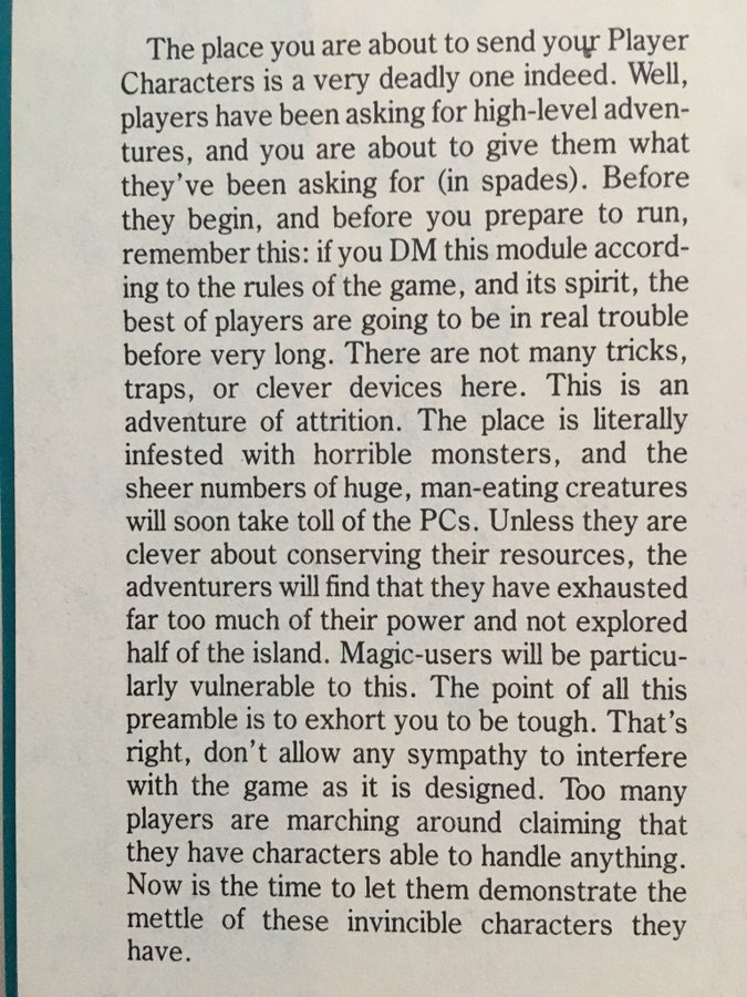 As the above text notes, Isle of the Ape is a different challenge than Tomb of Horrors, as ‘Ape simply overwhelms the characters’ resources with continuous waves of deadly foes. On the tropical island, their equipment will be subject to decay and spoiling, as well.