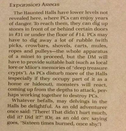The Haunted Halls module was originally intended to by a 128-page campaign starter and super-dungeon, true to its really historical place in D&D. But TSR chopped it down to 32 pages, leaving room for only one level. The text still hints, with some frustration, at more…