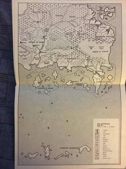 One remarkable thing appears in X1: a map of most of the gaming world known as Mystara, showing the Isle’s location relative to it! This is the gaming world created by Tom Moldvay and Lawrence Schick in the mid-1970s, and eventually adopted as the “official” D&D world.