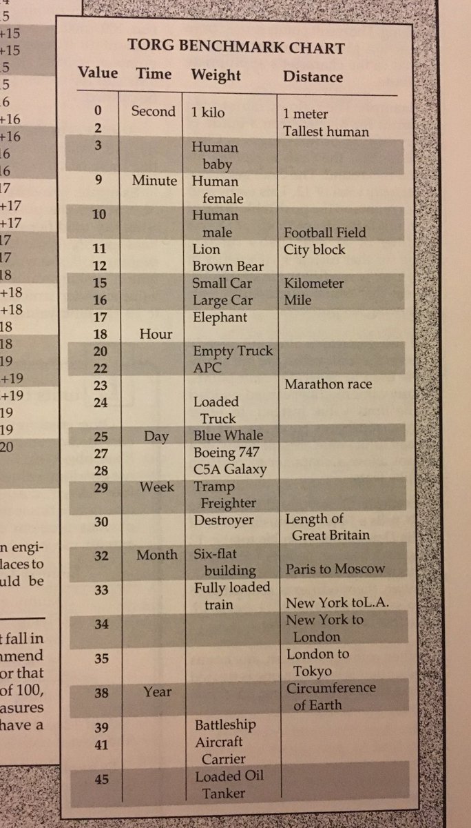 Torg introduced a lot of innovations that were rare or nonexistent in RPGs before. For example: character stats were on a logarithmic scale, with a factor of 10 increase for every 5 points, so huge ranges in abilities could be covered with a small number range.