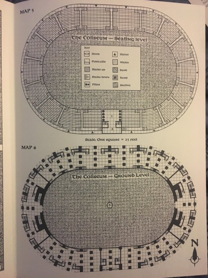 Then, after a key gladiator falls ill, the PCs must take his place and fight monsters in the arena itself! I should note that the arena is very well detailed in the module.