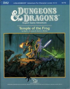 The first module, DA1, is a very strange introduction to the Blackmoor setting that takes place entirely in a single inn, but with time travel! DA2, Temple of the Frog, is a more standard dungeon adventure and in fact a revision of the first published adventure ever!