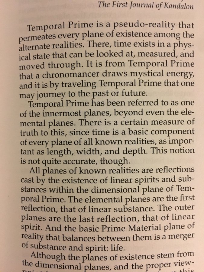 Traveling in Temporal Prime in the Chronomancer book is… trippy, at best. Here’s a description of Temporal Prime itself; see if you can actually parse what is being said.