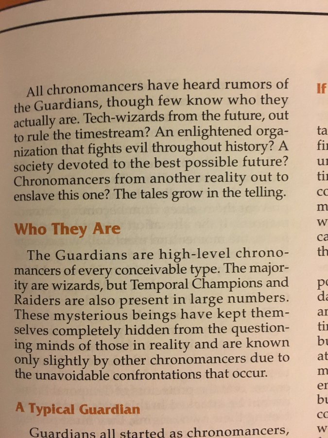 Things can get positively Doctor Who in Chronomancer, however — there are a class of superior Chronomancers, called Guardians, who have tasked themselves with protecting the timeline (and serve as a way for DMs to reign in out-of-control players).