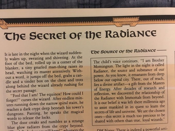 The “Radiance” is another callback to a classic D&D campaign setting, this time Dave Arneson’s Blackmoor, which we noted earlier was officially set 1000s of years before Mystara! In City of the Gods, discussed above, players can explore a crashed spaceship; the reactors of this ship, which get magically tinkered with by bored Immortals over the millennia, becomes the source of the Radiance!