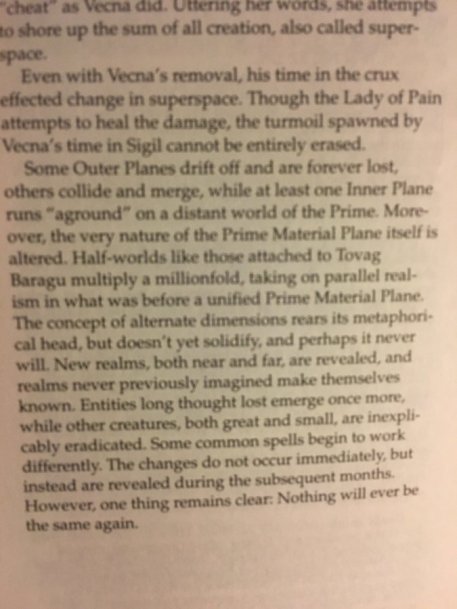 The PCs must pursue Vecna to a third world: the Planescape city Sigil, which is the very center of the multiverse. From that central location, Vecna aims to undo creation and build his own twisted reality.