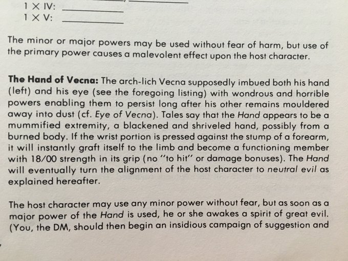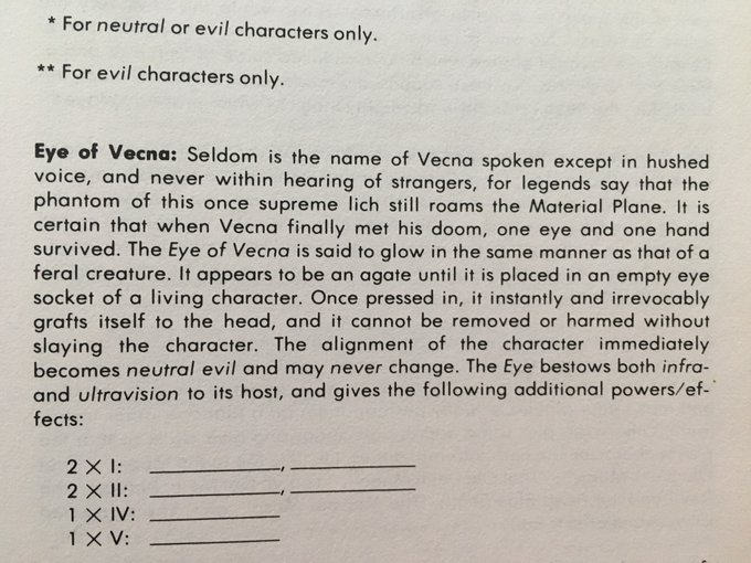 (This was the basis of a really dirty gaming trick by DM Mark Steuer, recounted in a 12/6/1996 post. He introduced the “Head of Vecna,” which would grant incredible powers, but only to those who first removed their own head. But it was a hoax artifact.)