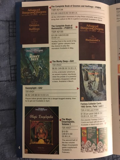 I would’ve been a little bummed about this purchase, but — it came with a 1993 TSR catalog still included! I kind of love looking through old gaming catalogs, both to see old and forgotten products as well as improvements in graphic design.