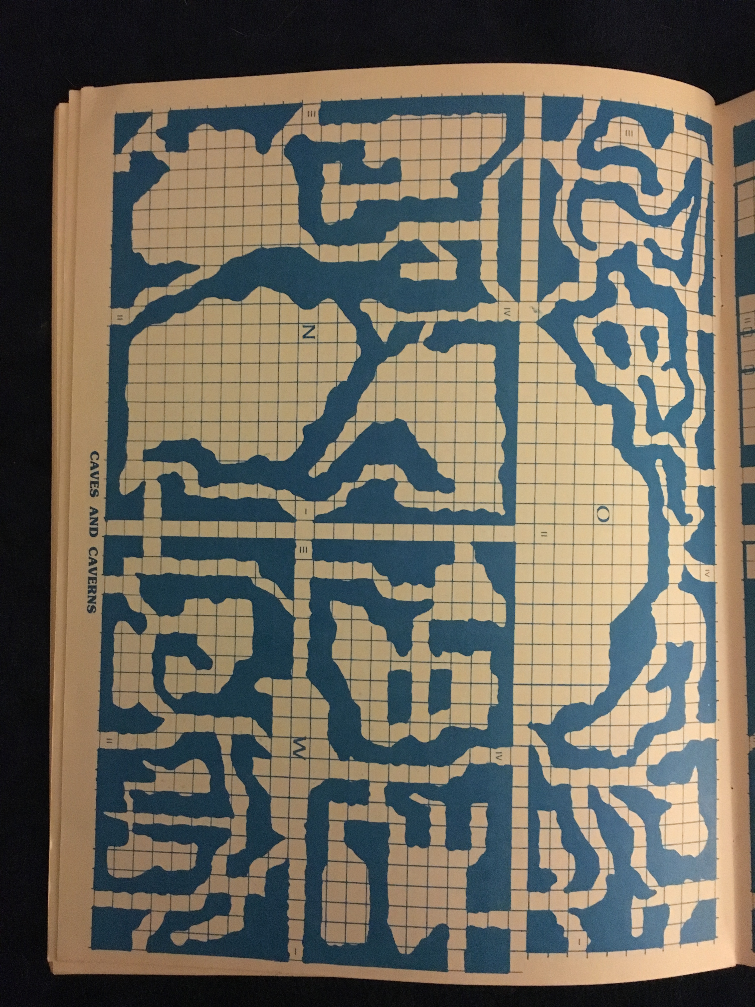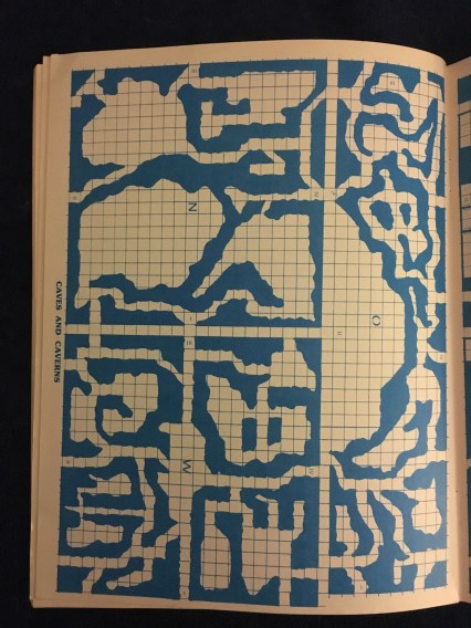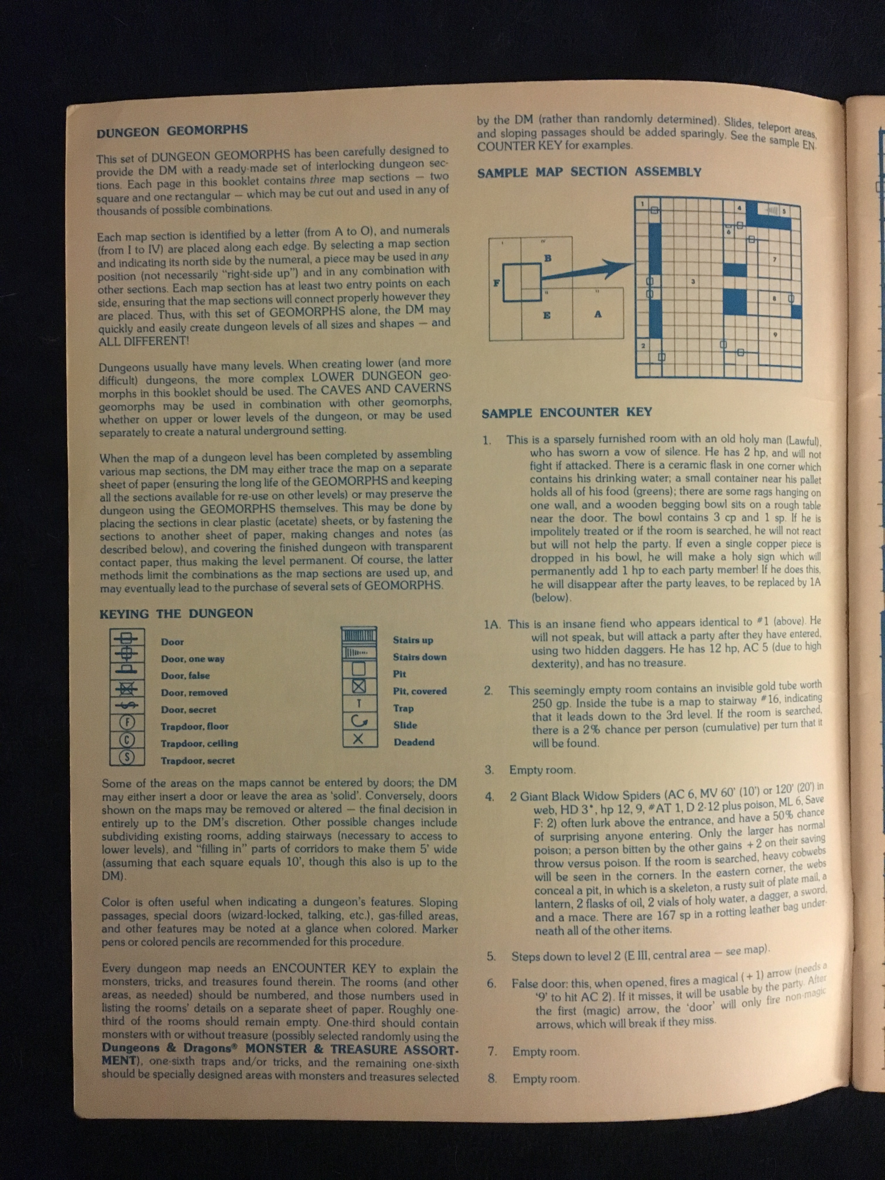 Each page could be cut into two square sections and one rectangular section, allowing construction and arrangement in any number of ways. It also gives a brief tutorial on populating the dungeon. Oh, heck, here’s the explanation from the book.