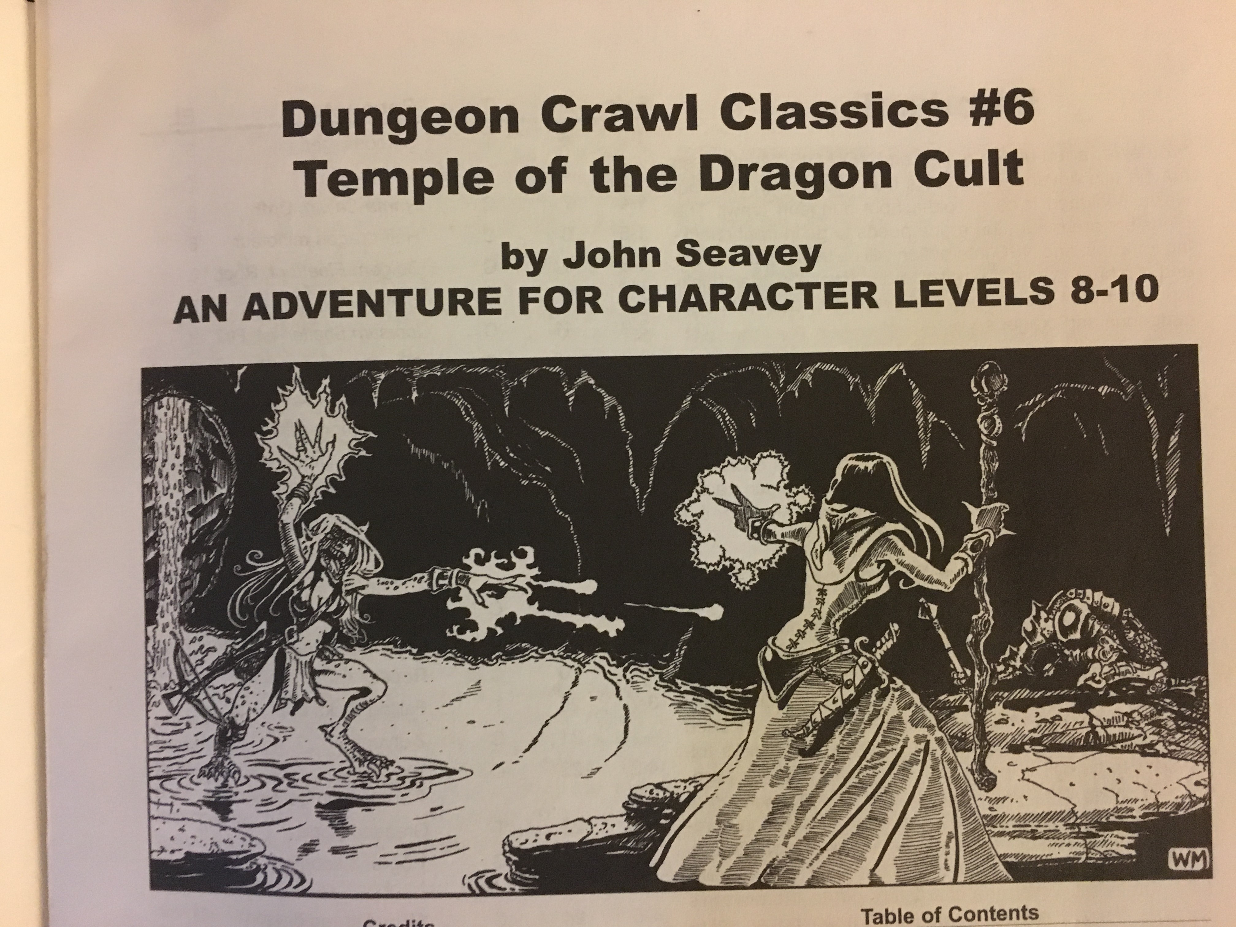 DCC #6: Temple of the Dragon Cult (2004), by John Seavey.  In looking at old school D&D, it would be negligent to not look at some of the products of the more recent old school revival, such as the Dungeon Crawl Classics line of adventures.
