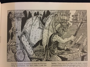 All of the maps and illustrations were also done by the multi-talented Jaquays, such as this powerful demon lord that the PCs might have the misfortune of unleashing. One thing I love about Jaquays’ adventures is that they really mercilessly punish careless characters — if the players do not pay attention, their characters will suffer for it!
