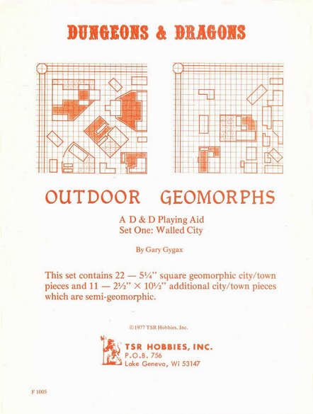 Interestingly, there was also a Set 1 of “Outdoor Geomorphs” released in 1977, but the planned Sets 2 and 3 were never published. Evidently Set 1 gives some fascinating Gygax-penned details about the City of Greyhawk, never released elsewhere!