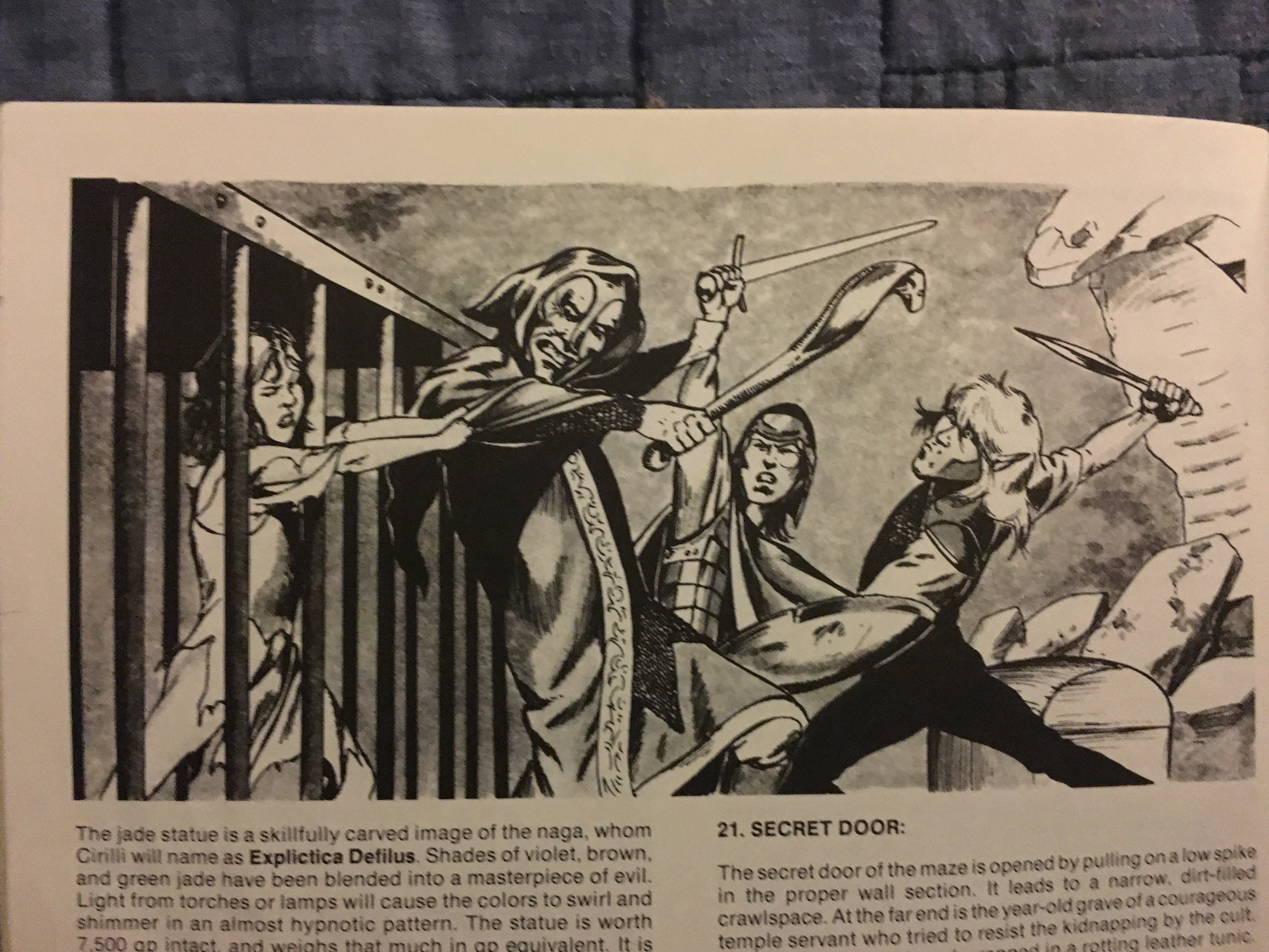 After learning of the cult’s base of operations, and hopefully gathering a few powerful non-cult village allies in the process, the PCs then do a wilderness adventure, trekking to the swampy lair of the cult, a two-level dungeon. The dungeon itself isn’t spectacular, but it’s really the whole journey – village, wilderness, dungeon – that makes the adventure special. I also like this illustration of a captured villager not being the stereotypical helpless damsel in distress.