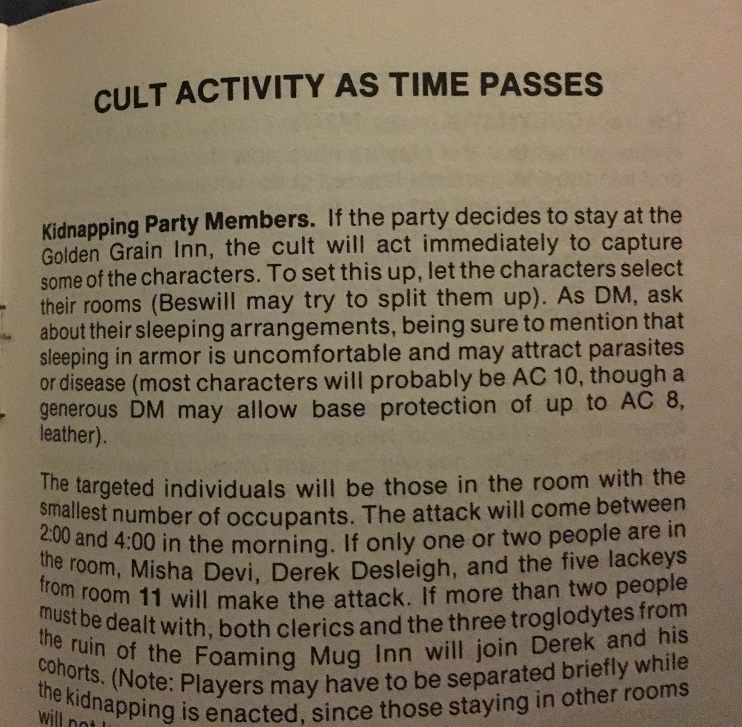 This makes the module surprisingly advanced for a “novice” adventure. The players (and DM) have to have a lot of conversations, and the DM has to keep track of how the whole town reacts to the PCs actions! Fortunately the book gives tips on how to handle things.