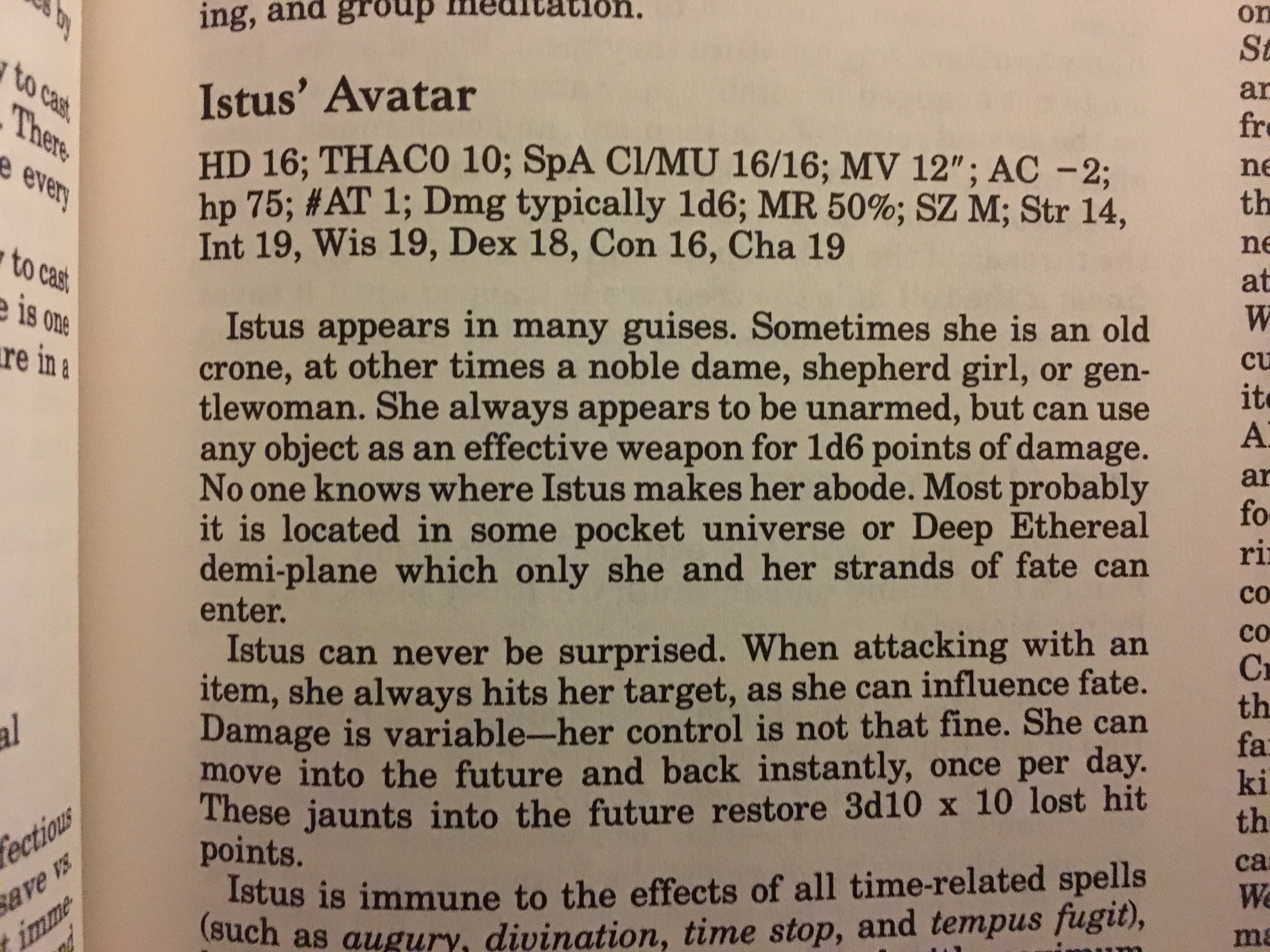 For example: there is a detailed section about the deities of Greyhawk, including stats. For the first time, the concept of an ‘avatar’ of a god is introduced: if you fight & kill the god on Oerth, you’ve just killed one of its bodies.