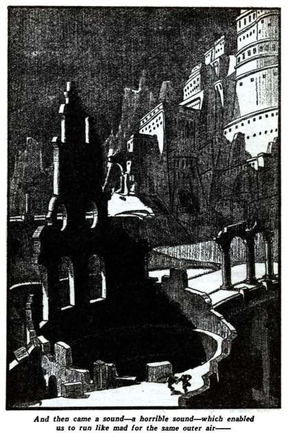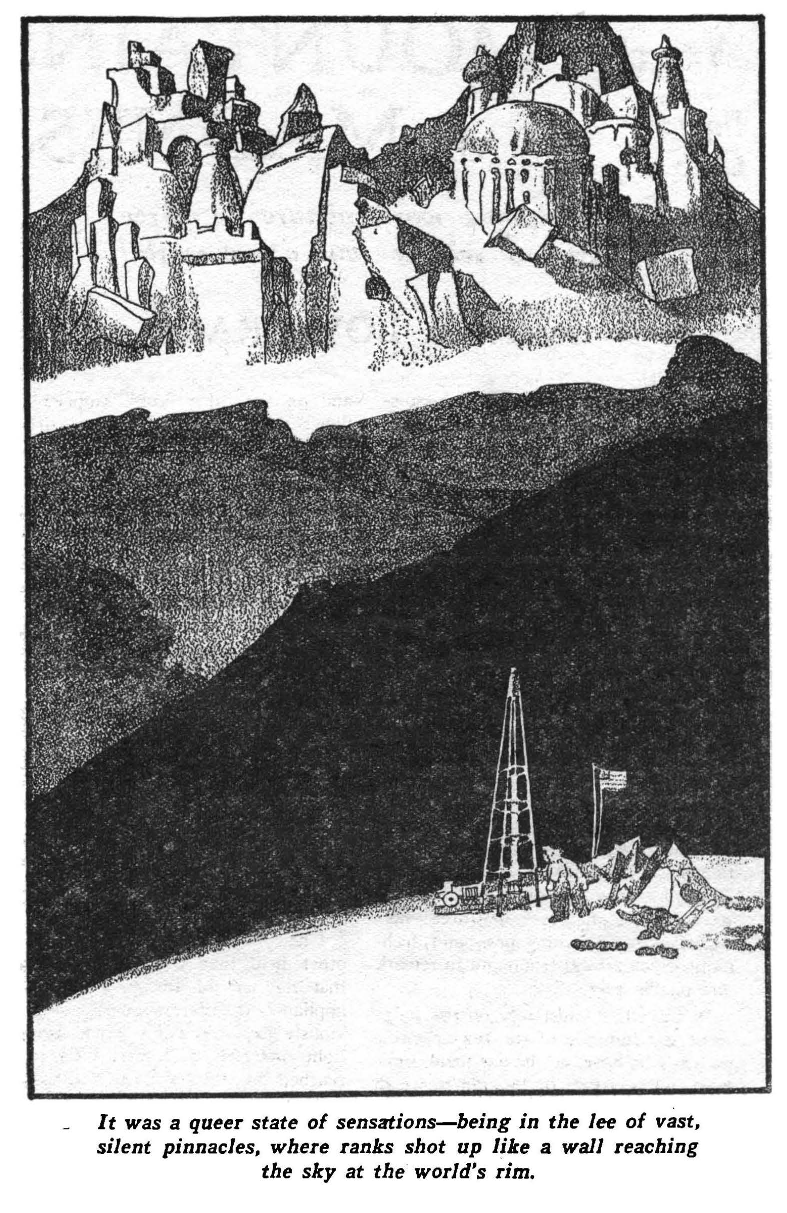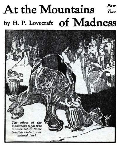 At the Mountains of Madness, by H.P. Lovecraft (1936), in Astounding Stories. Illustrator unknown.  We conclude this post with Lovecraft’s masterpiece: a novella about Antarctic explorers who discover a massive, previously-unknown mountain range and the remains of the utterly inhuman beings that used to populate it. But not everything that once occupied the city is completely dead…
