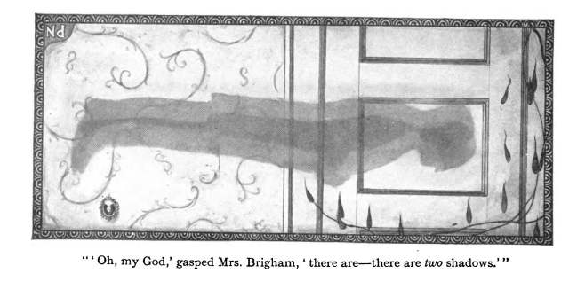The Shadows on the Wall, by Mary E. Wilkins-Freeman (1903), in The Wind in the Rose-Bush. Illustrated by Peter Newell. This is Wilkins-Freeman’s most famous tale of terror, and it is well-deserved recognition. In the midst of grieving over a death, members of the Glynn and Brigham families are tormented by a sinister apparition: a shadow in a room which should not exist and looks disturbingly like their late relative.