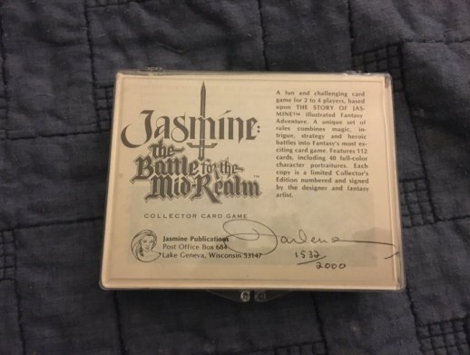 Jasmine: The Battle for the Mid-Realm Collector Card Game (JBMR for short here) came out in 1982, when most people probably still considered Monopoly to be the state of the art in tabletop gaming and years before board games like Settlers of Cataan and a slew of collectible card games would change the gaming landscape forever. Nevertheless, JBMR feels right at home in the modern gaming landscape, with rules that are easy to learn, possess significant depth of strategy and, most importantly, are fun to play.