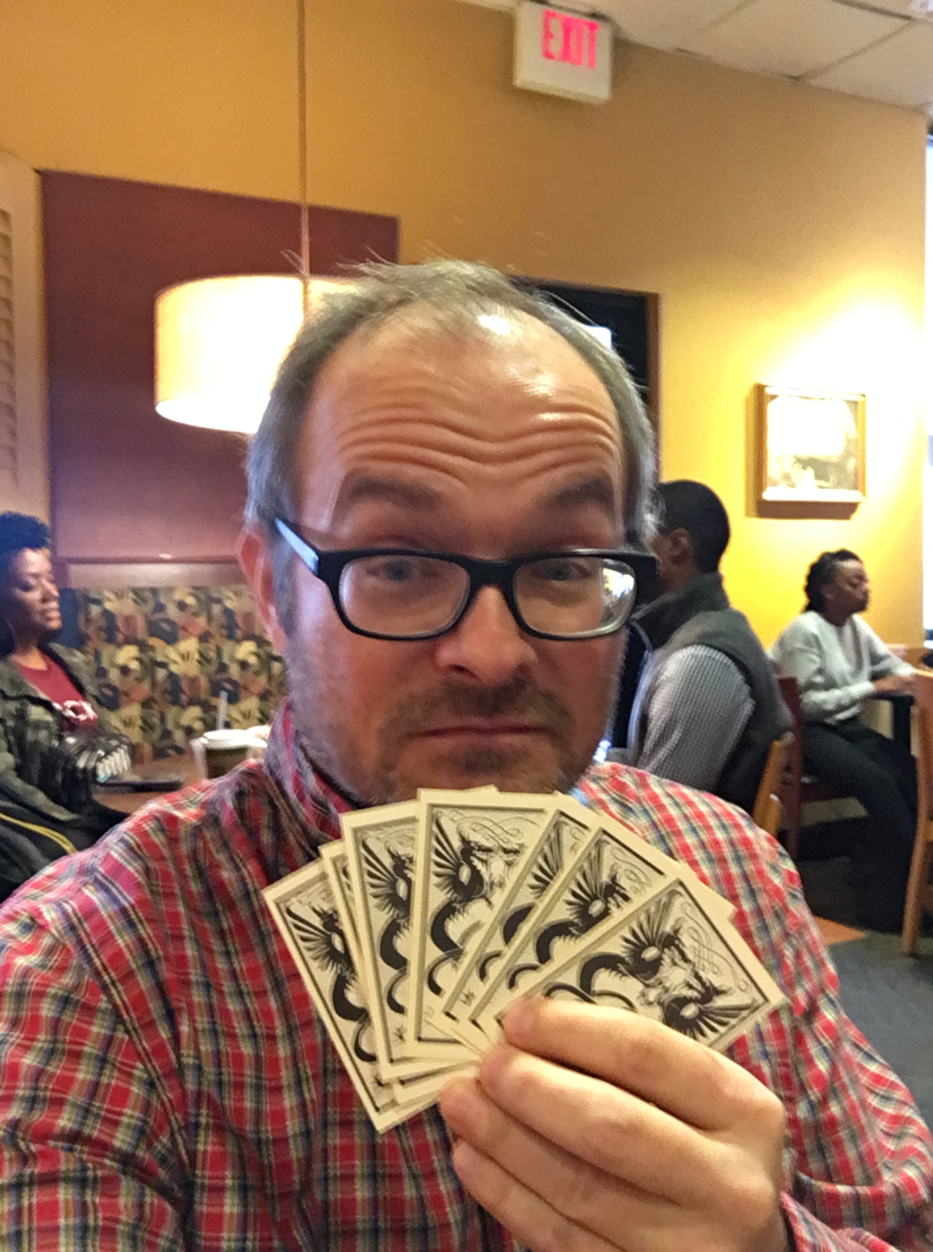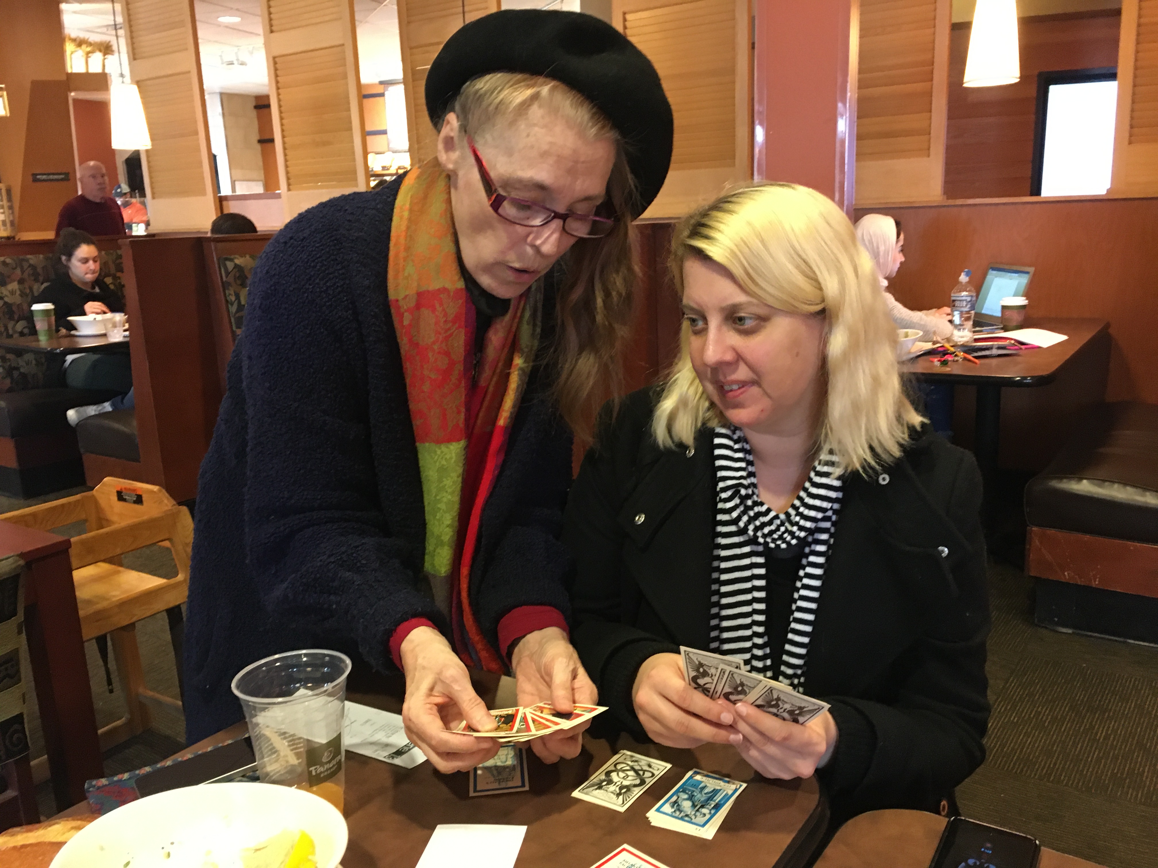 So I want to talk a bit about the game itself, but first let me share the delightful part: it turns out that Darlene lives not terribly far away from me, and noticed this when she was shipping the game. She graciously offered to come personally teach me and my friends how to play! My roommate Sarah and I met Darlene yesterday to have lunch and learn the game, and it was a great time. I took a few photos to commemorate the occasion, which I will share near the end of the post.