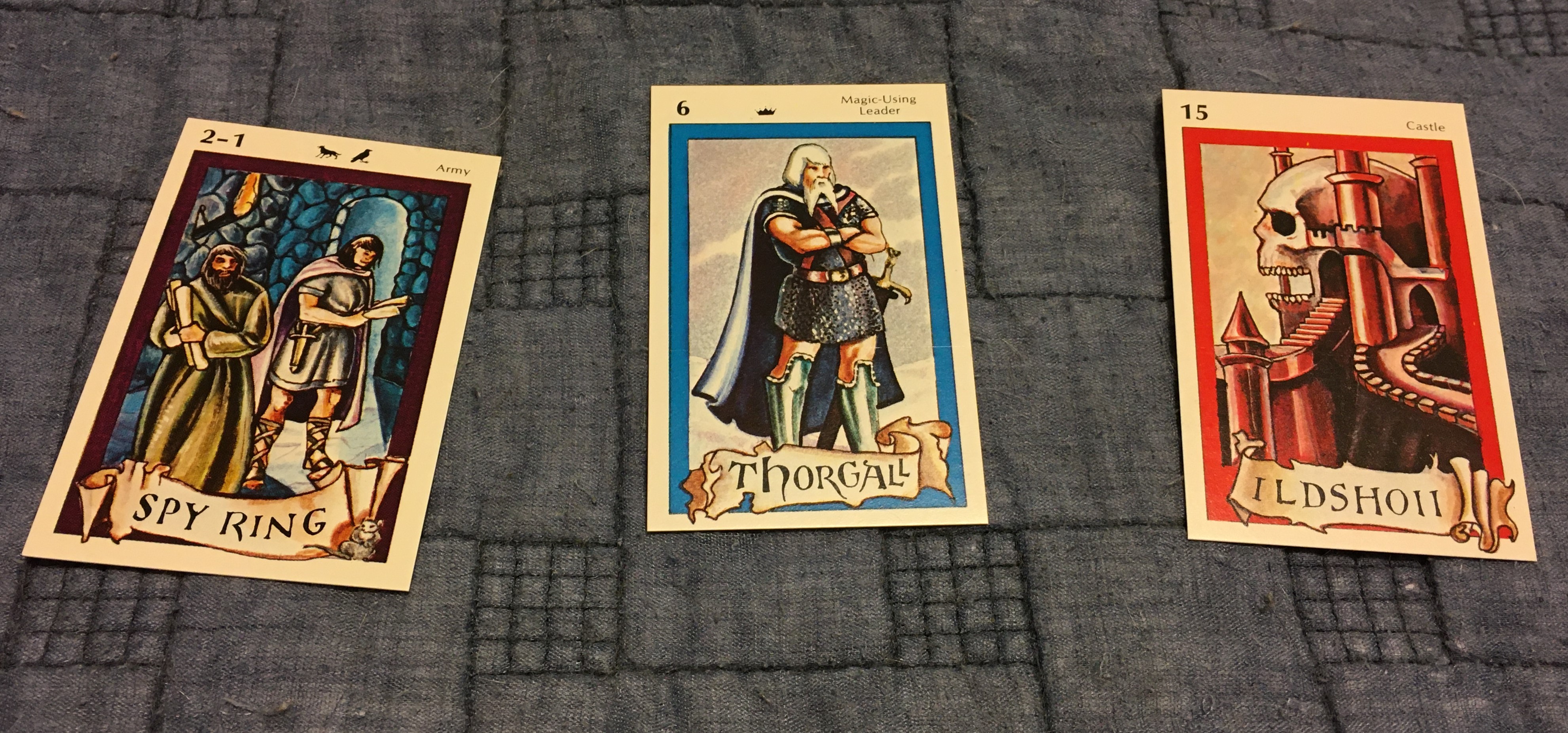 There are some special attack cards, like “AMBUSH,” that allow one to play dirty tricks on opponents. AMBUSH allows the kidnapping of an enemy leader, provided the enemy doesn’t have a counter to it, like the MAGICAL FORCES card. ATTACK cards are used to launch attacks, obviously, and the number after it indicates how many force members may be used for the attack. There are comparable DEFENSE cards that must be used for defense. In a 2 or 3-player game, POLITICS cards allow one to attack or defend using a different faction, saving your own forces. And the final card shown there is one of the magical items, which can be held in the castle for a victory condition or used in combat.