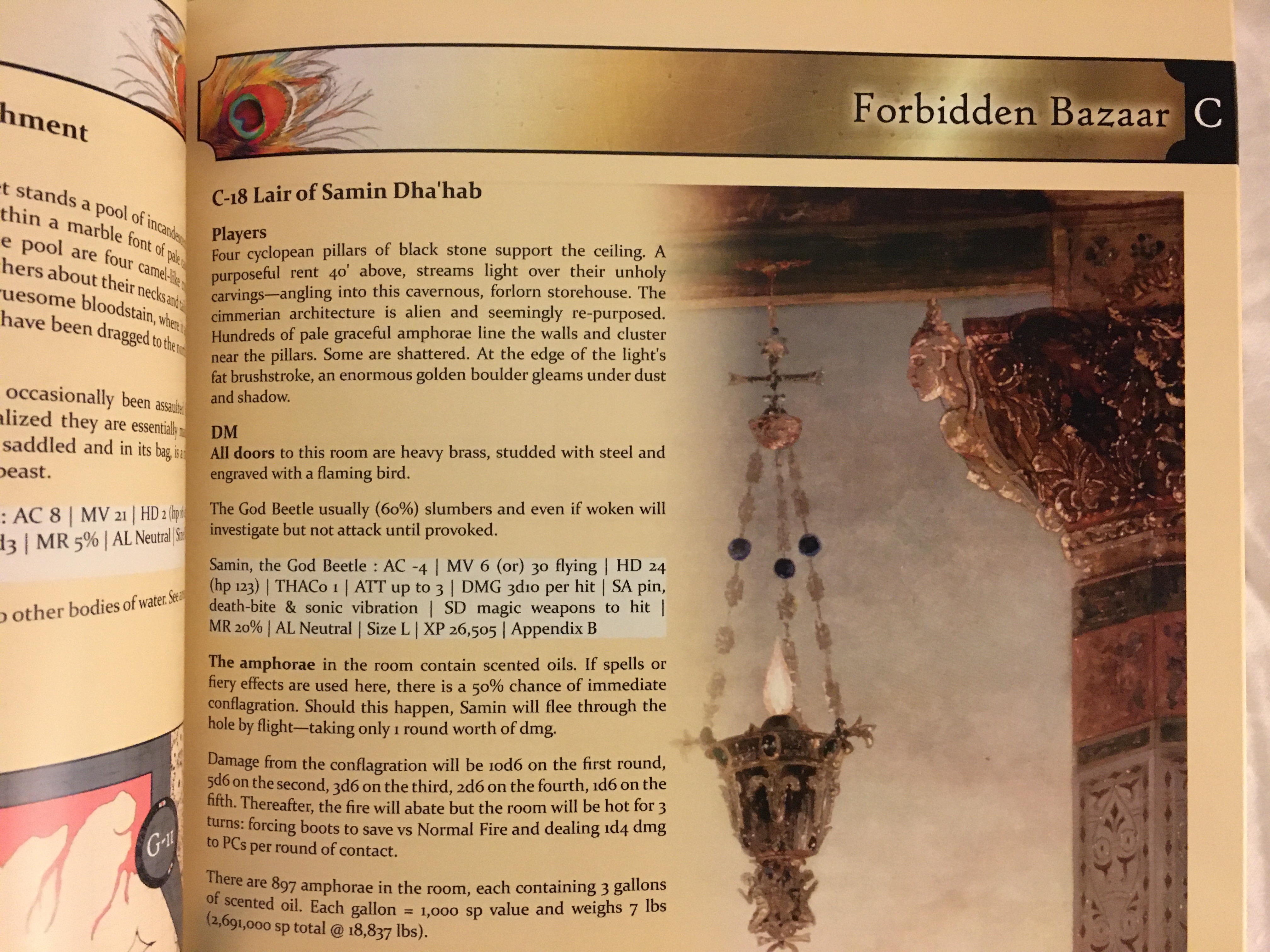 Here’s a part of a page that gives an idea of some of the lovely illustrations within. Also, note the incredibly powerful “God Beetle.” This is not an adventure for casual explorers: it is filled with powerful monsters and super-deadly traps.