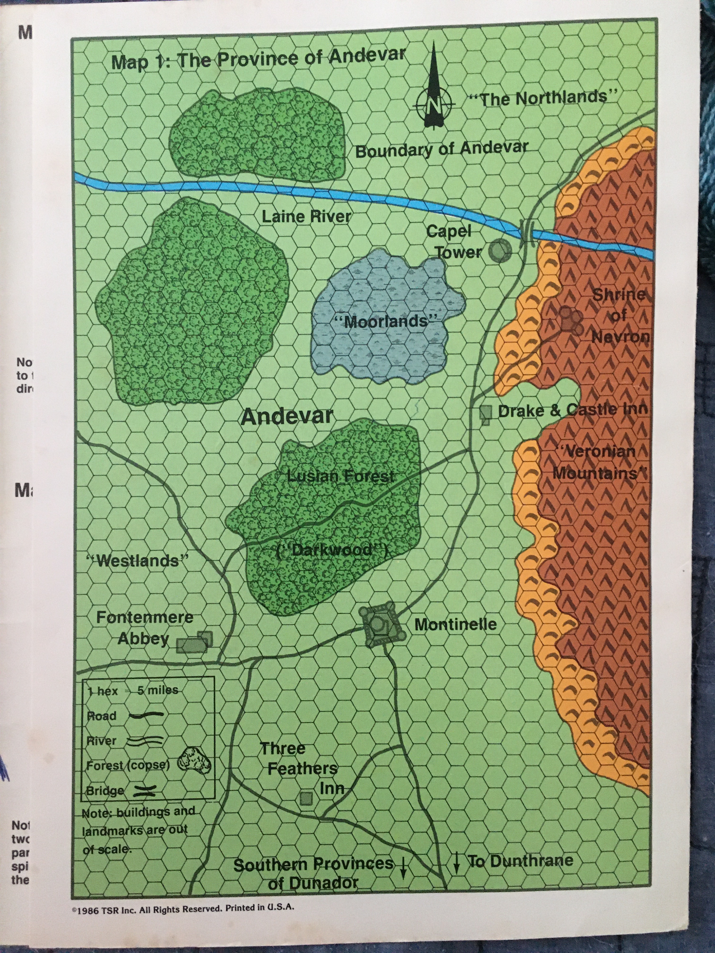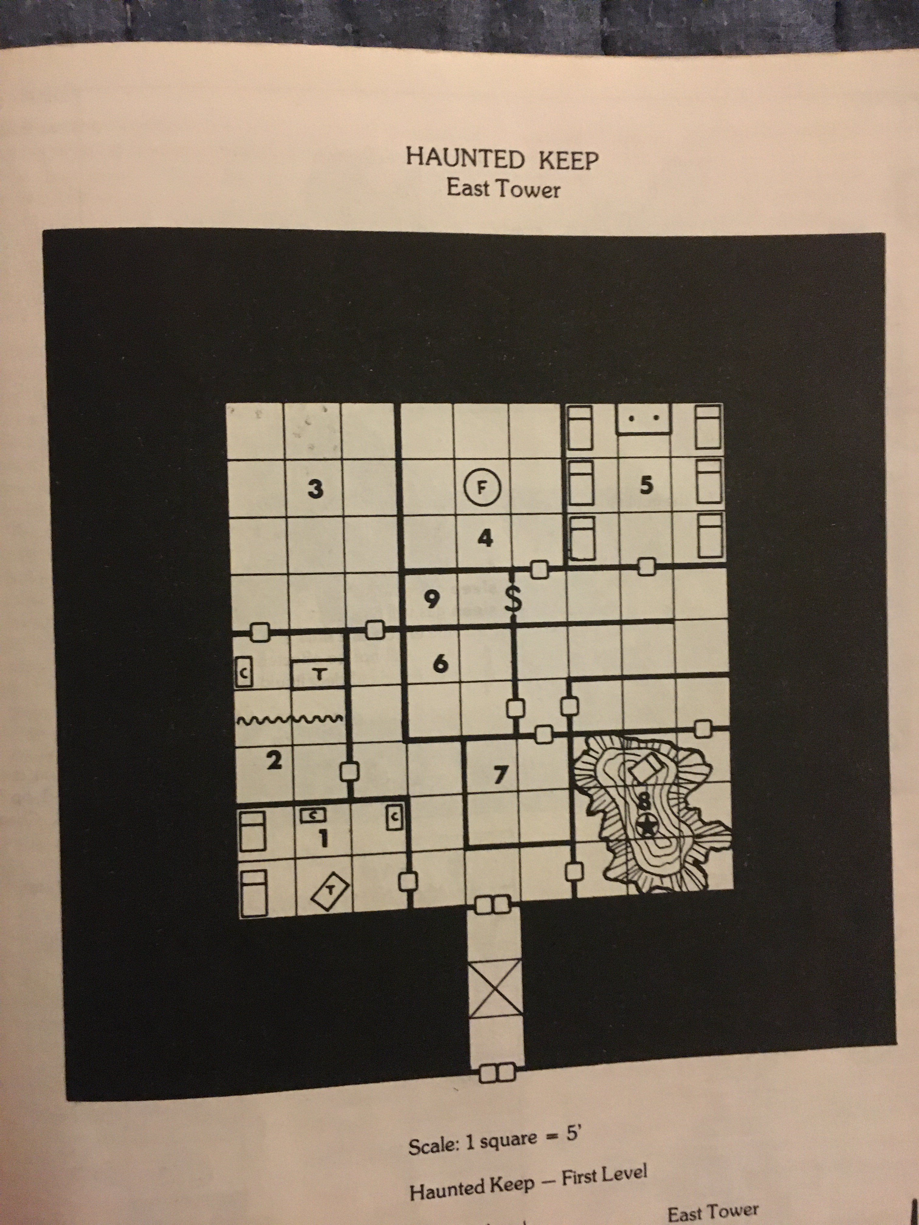 This is another one of those adventures that I wasn’t interested in when I was younger. I think I was only intrigued by adventures set in weird locales, with fantastic beasts! The strange and vague cover image didn’t help, but it does, in fact, represent a key scene in the adventure! The art on module covers did not always have anything to do with the content, so it is nice to know it matches.
