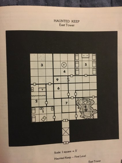 The Rulebook also included a short snippet of a sample dungeon, to give DMs an idea how to plan an adventure. In a nice bit of consistency, the sample dungeon expedition shown above is a snippet of what happens after the PCs go beneath the Haunted Keep. Note that Morgan Ironwolf is a party member!